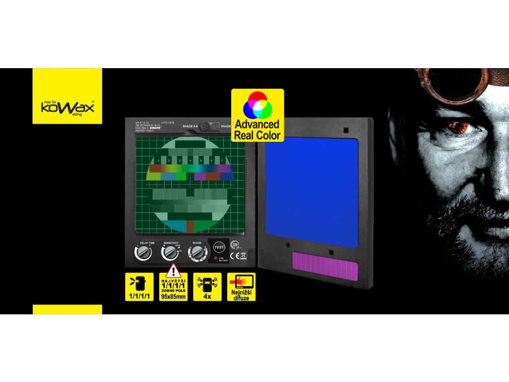 - Nejvyšší optická kvalita filtru 1/1/1/1 EN379, i v této specifikaci jsou mezi jednotlivými produkty na trhu značně rozdíly. KOWAX překonává světovou konkurenci a definuje novou úroveň optického komfortu pro svářeče díky o řád lepším výsledkům v difuzi světla přes zatmavený filtr (druhé číslo ve specifikaci dle EN379 – rozostření – viz.naznačeno viz.naznačeno zde), tato hodnota je zcela zásadní pro opticky komfort při svařování. Vaše oči musí méně doostřovat, což má za následek méně unavené oči, menší sklony k bolení hlavy atd. Poznáte rozdíl.