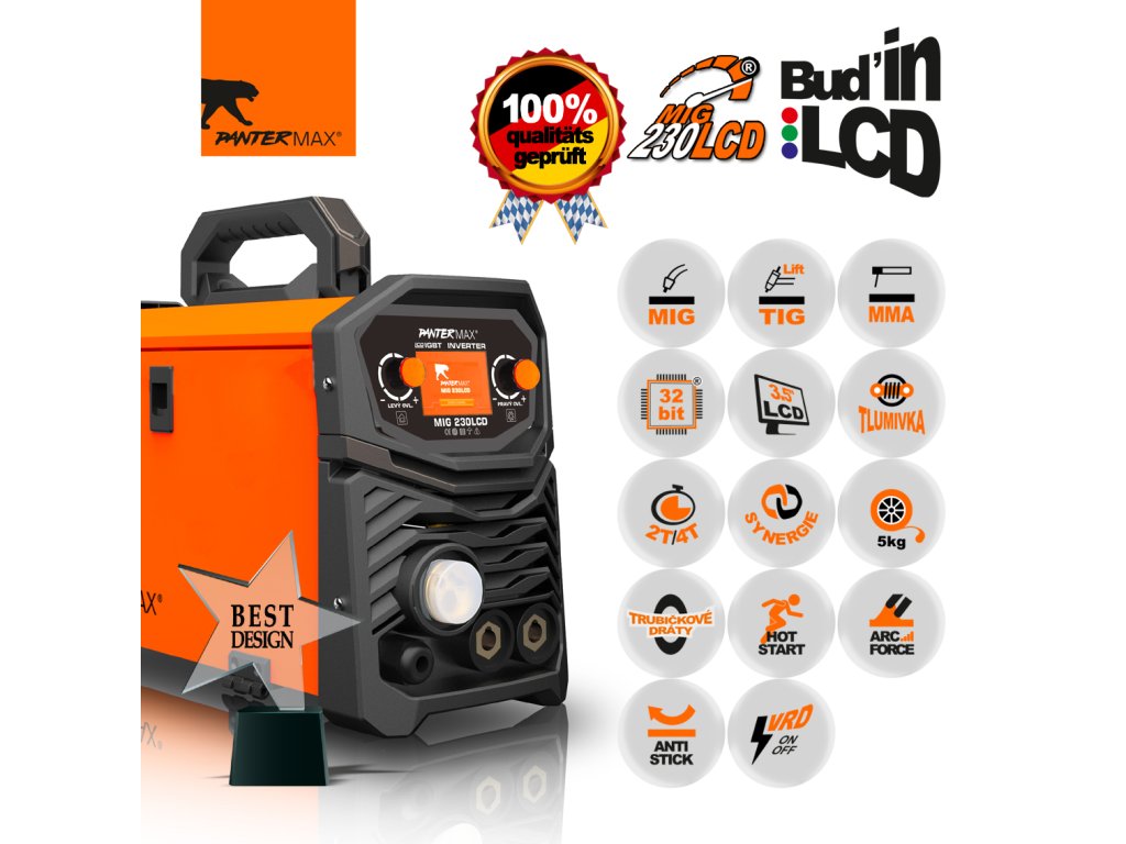 PANTERMAX® MIG230LCD je synergický mikroprocesorový svařovací zdroj pro svařování metodami MIG/MAG/MMA/LiftTIG. IGBT invertorový zdroj řízený 32bitovým procesorem a velkým barevným LCD displejem umožňuje svařování metodou MIG/MAG za použití jak standardních plných drátů v ochranné atmosféře plynu (např.G3Si1), tak i trubičkových drátů s ochranným plynem nebo bez. Grafické rozhraní a synergie použitá ve zdroji usnadňují používání a umožňují použití zdroje i lidmi s minimálními zkušenostmi. IGBT technologie umožňuje významné snížení hmotnosti a rozměrů zdroje a zvýšení účinnosti při snížení spotřeby energie.