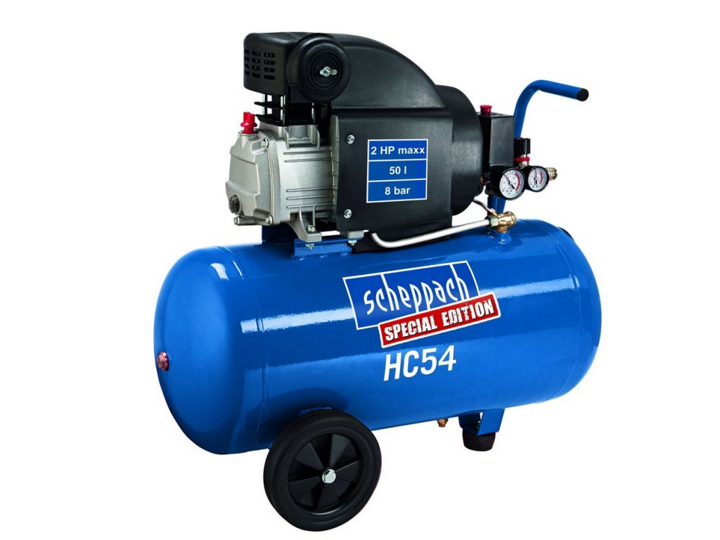 Výkonný kompresor Scheppach HC 54 je ideálním pomocníkem do každé domácí dílny nebo garáže. Díky velkému vzdušníku o objemu 50 litrů se jedná o výkonného a mnohostranného pomocníka. Pumpa kompresoru je mazána olejem, což prodlužuje životnost celého stroje i při častém používání. Aby byla kontrola oleje jednoduchá, je kompresor vybaven optickým ukazatelem jeho stavu. Vzdušník slouží jako zásobárna stlačeného vzduchu a motor se tak zapíná jen v případě, že tlak vzduchu klesne pod požadovanou úroveň. Díky velkému objemu vzdušníku můžete s kompresorem mimo běžného huštění a ofukování provádět i náročnější operace s použitím různých druhů pneumatického nářadí (sponkovačka, hřebíkovačka, utahovák,...), je vhodný pro připojení mycí pistole, stříkací pistole, pískovací trysky ap. Při dofukování pneumatik oceníte jednoduché nastavení výše tlaku, který můžete snadno kontrolovat pomocí přehledného manometru. Přídavné madlo a kolečka umožní snadnou manipulaci se strojem.