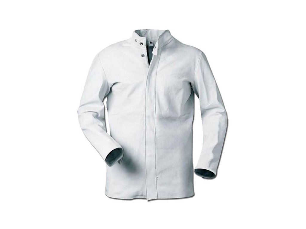 Ochranný kabát pro svářeče ze světle hnědé štípené hovězí kůže, záda z modré pevné bavlněné tkaniny se sníženou hořlavostí