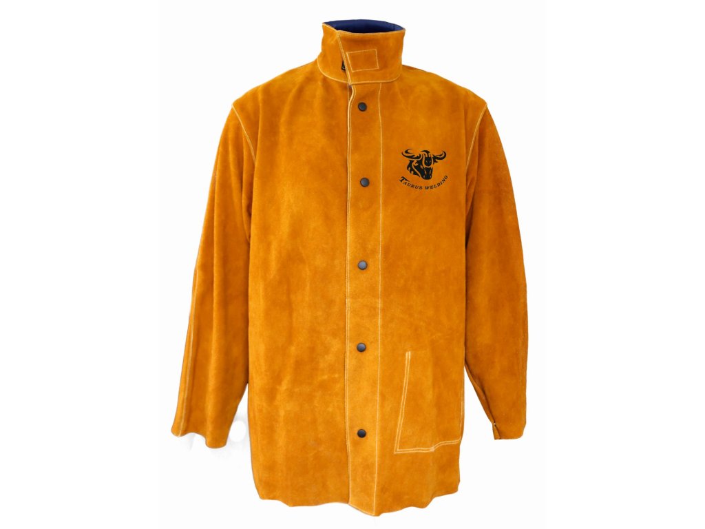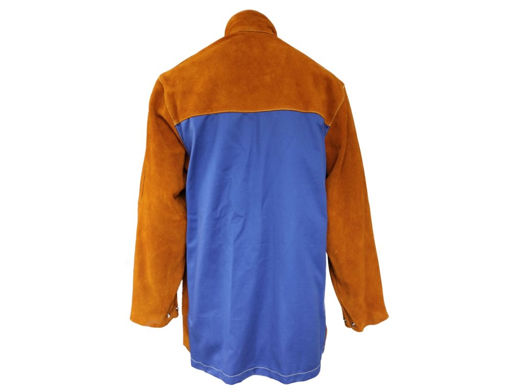 Ochranný kabát pro svářeče ze světle hnědé štípené hovězí kůže, záda z modré pevné bavlněné tkaniny se sníženou hořlavostí