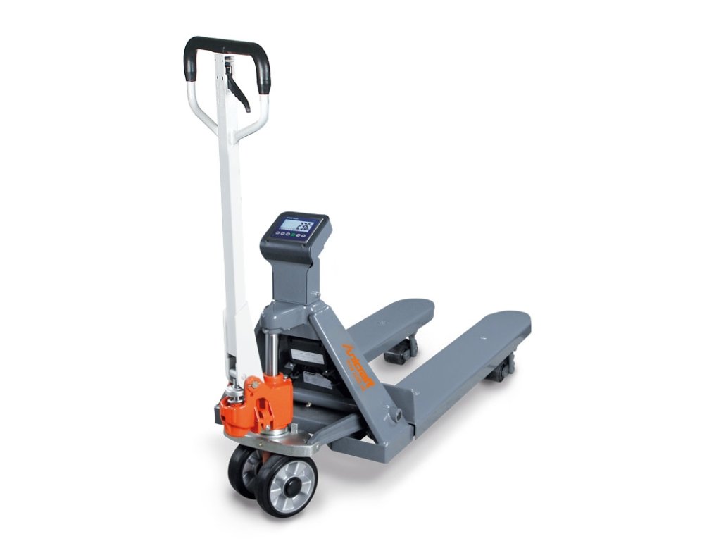 Profesionální paletový vozík se zvedací silou 2 tuny a integrovanou elektronickou váhou a tiskárnou, vhodný jako kontrolní váha pro každodenní použití.